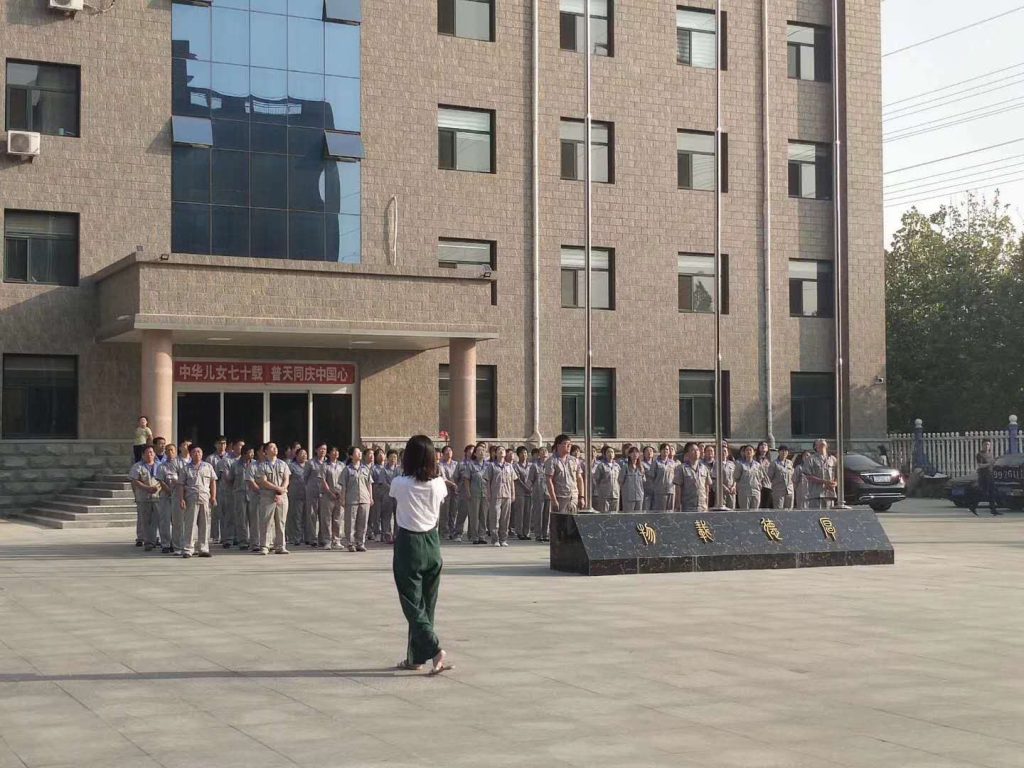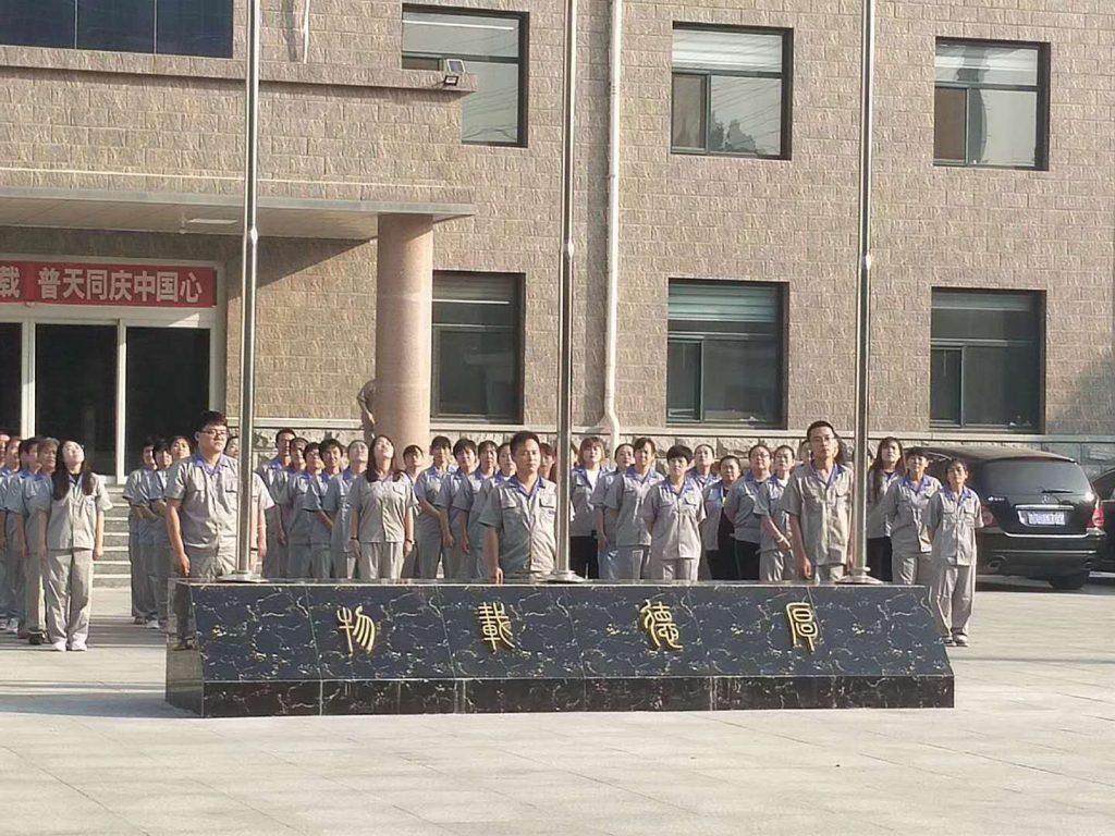 Ровно в 8:00 утра началась церемония. Под торжественное звучание государственного гимна медленно подняли национальный флаг Китая. Все сотрудники стояли по стойке смирно, прослушивая гимн, выражая глубокое уважение и добрые пожелания своей стране. Затем под бодрую мелодию фирменного гимна подняли корпоративный флаг «Цзю Син Шусяо». Развевающийся флаг символизирует динамичное развитие предприятия и объединяет стремления каждого сотрудника компании.